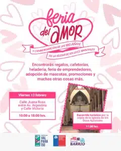 Con una jornada abierta a la comunidad, este viernes 13 de febrero, se realizará la Feria del Amor en el Barrio El Almendral de Valparaíso. La actividad se desarrollará entre las 10:00 y las 18:00 horas, en calle Juana Ross, entre Avenida Argentina y calle Victoria, y contempla una programación orientada al encuentro comunitario, la puesta en valor del patrimonio local y el fortalecimiento del comercio de barrio.