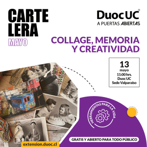 ¡Lo que muchos estaban esperando! Vuelven las manualidades a la cartelera del Centro de Extensión Duoc UC Sede Valparaíso. Esta vez con el taller «Collage, memoria y creatividad», el cual se realizará el próximo sábado 13 de mayo, a las 11:00 horas, con acceso liberado al público.